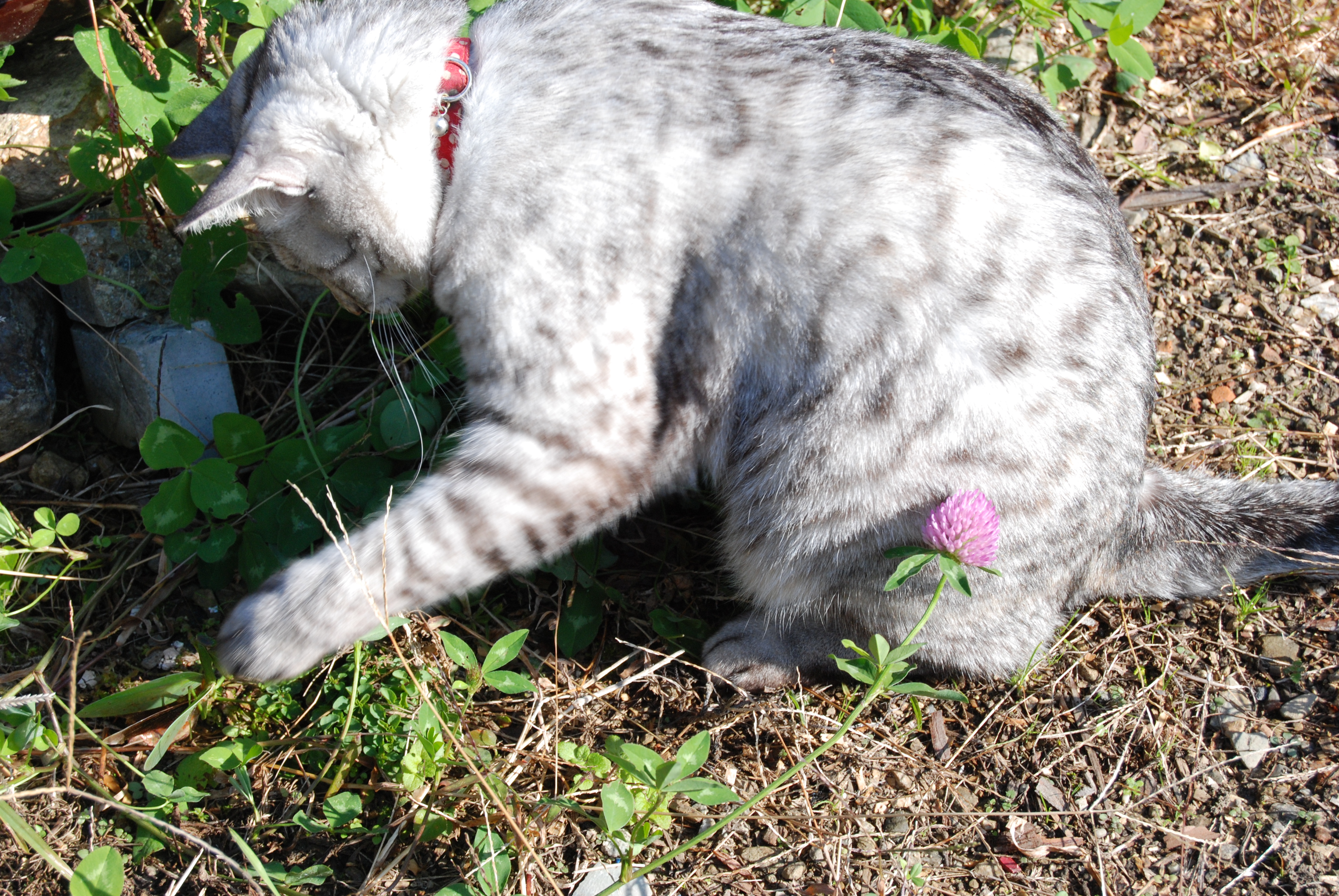 (↑クローバーのあったところで、カマキリをいじっているニャンコ)
