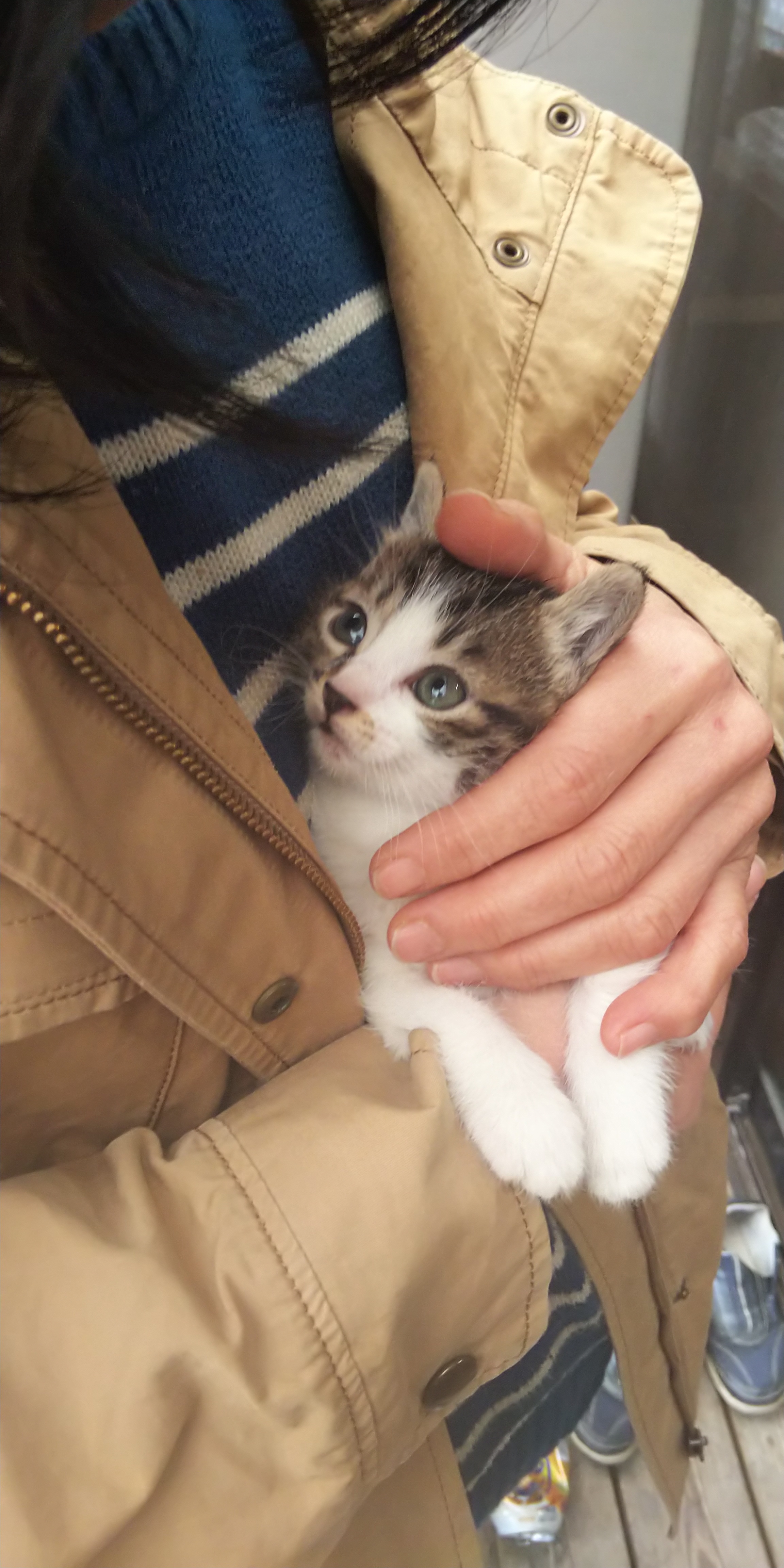 ↓ こちらも春の訪れ。ご近所さんの猫が生んだ子猫を抱っこさせてもらいました。少し年のいった猫なので生んだのはこの一匹だけ。いつも子猫生まれたら里親にだしてたけど、1匹だけなので今回はこのまま育てるそうです。