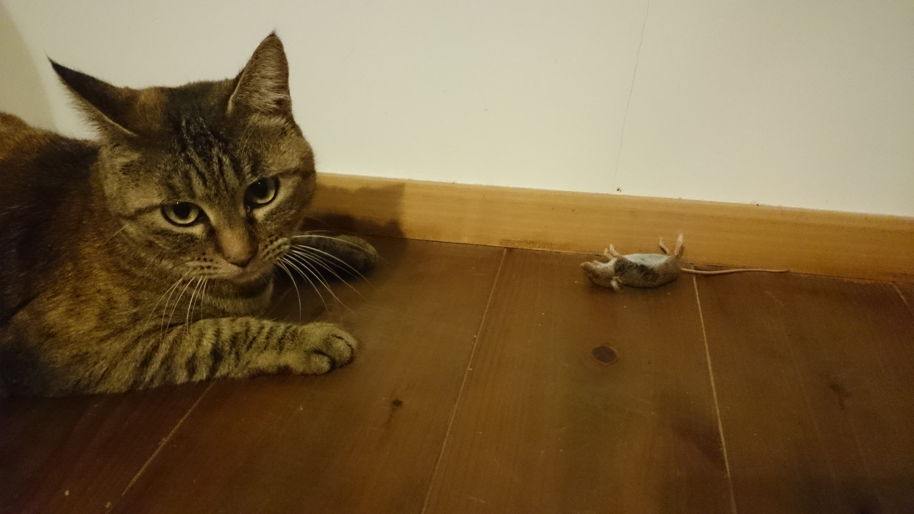 ↓ 我が家の一足早い春の訪れ:ニャンコが野ネズミを連れてくる(悲鳴)。