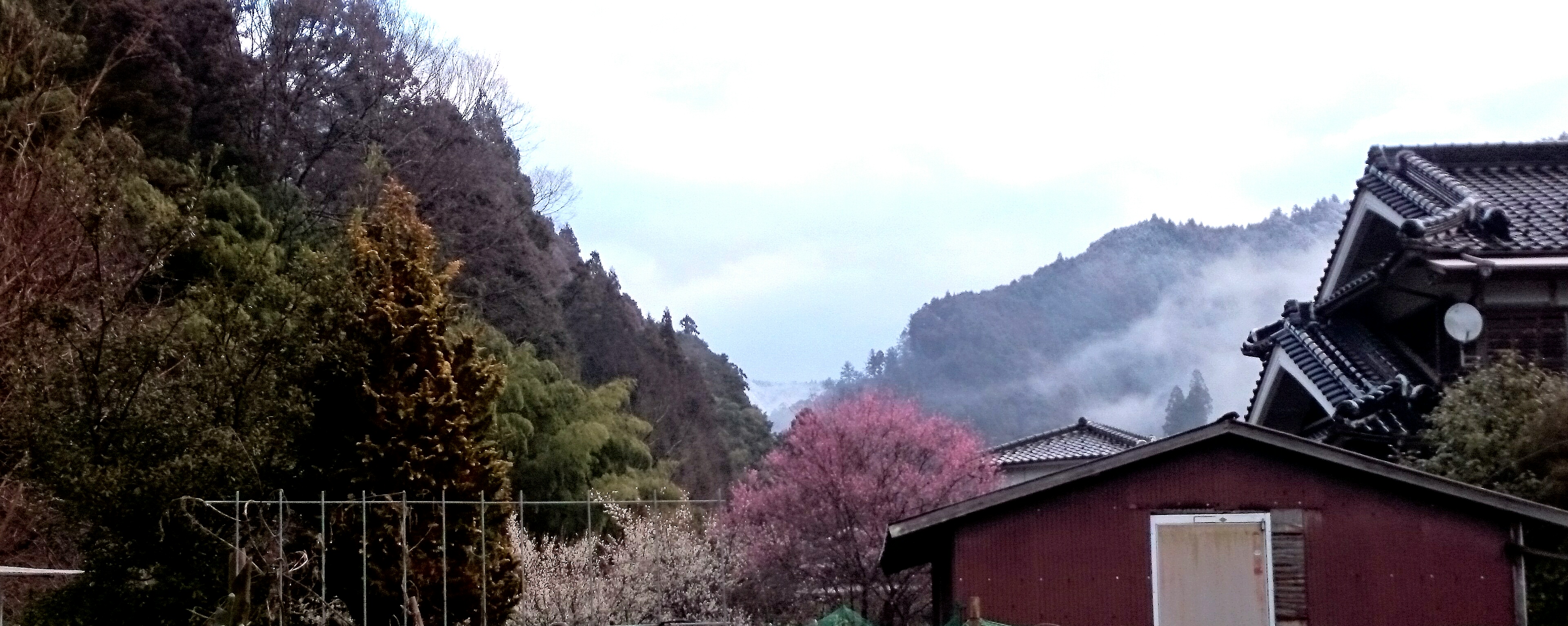 ↑ 台所の窓から毎朝みる風景。山と山の間にみえる空の多彩さにいつもみとれます。手前にはご近所さんの梅と桃が満開。ウグイスも鳴いていて、いつのまにかしっかり春になってます。