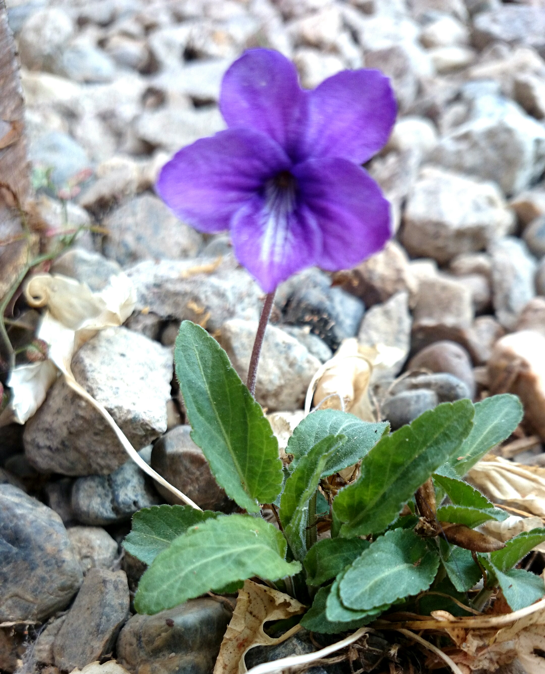 ↓ 洗濯物干し場のジャリの間に、一輪だけりりしく咲いたスミレ、美しい(肝心の花がピンぼけなのもまた意味がある…汗)。