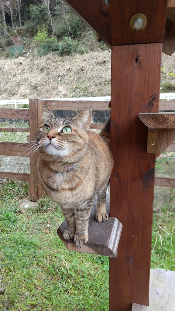 東屋(あずまや、洗濯物干しの屋根兼用)の柱に設置されたキャットツリーに登ってるスコッチ。