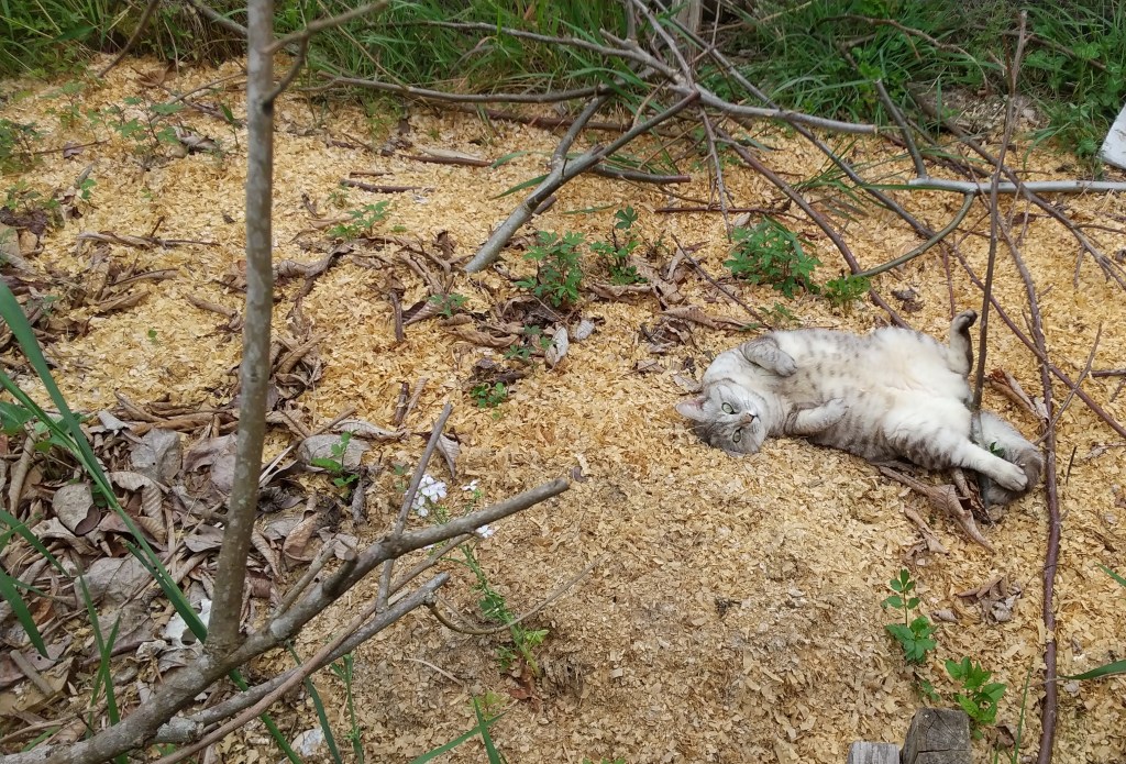 木の削りカスをそのうち肥料になるだろうと撒いてる場所があるのですが、感触が心地よいからか?よくここで寝そべってる&お腹おっぴろげのミヌ(汗)↓