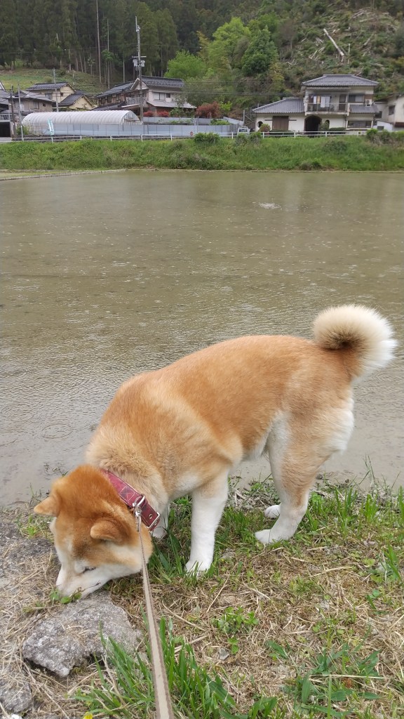 すでに水が入った田んぼ ↓  柴犬はモグラを一生懸命探してるようです。
