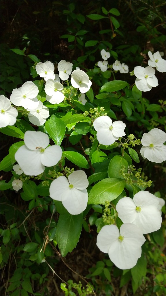 この時期に咲いてる花で一番心惹かれるのが、コガクウツギ(小額空木)↓ 見た目のとおりアジサイ科アジサイ属です。山の斜面の少し木の影になる涼しげな場所に可憐に咲いています。
