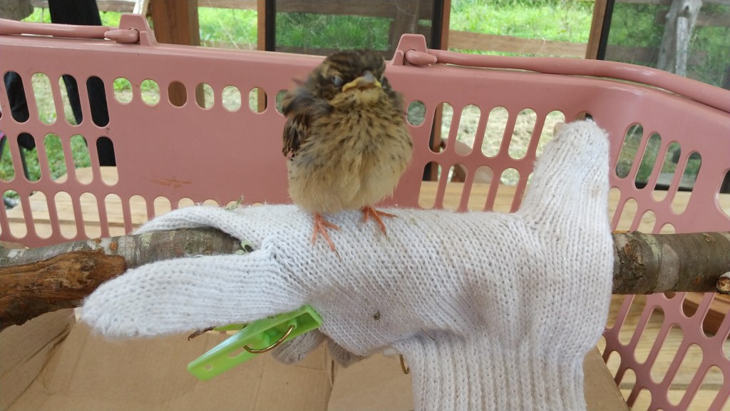 親鳥は人間がいると近寄ってこないので、このつかまり枝のマイバスケットごと、少し離れた場所に置いて様子をみました。できることなら親鳥の元に帰ってほしい(祈)。