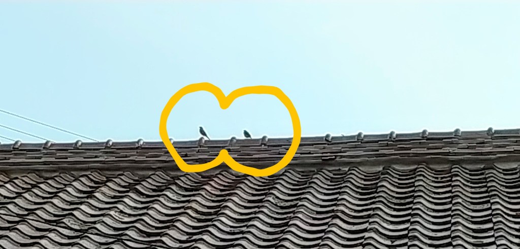この子はまだ飛べない子なんだろうな、と思いつつ、このままだと今晩この子はどうなるんだろうと心配になった頃、やっと屋根のてっぺんで親子合流しました ↓