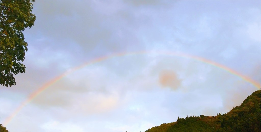 ↑ 先日の夕方、家からみた虹、山と山をつないで大きな橋が架かっていました。