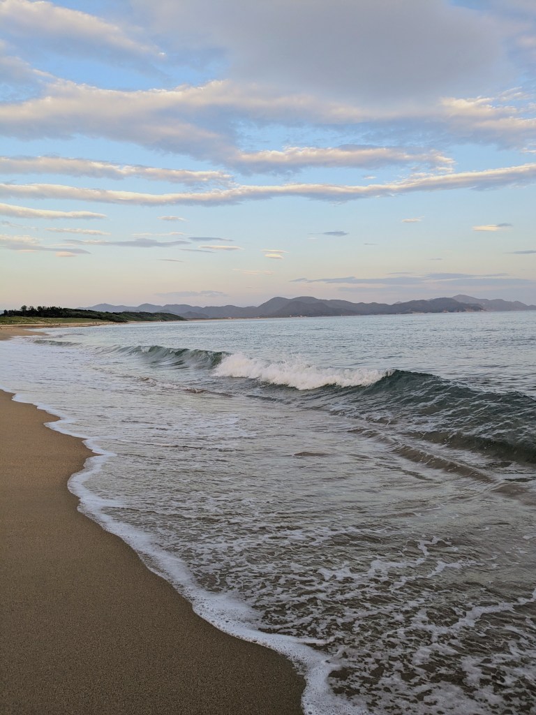 早朝の海。人いなくて静か、爽やか、波の音だけ。