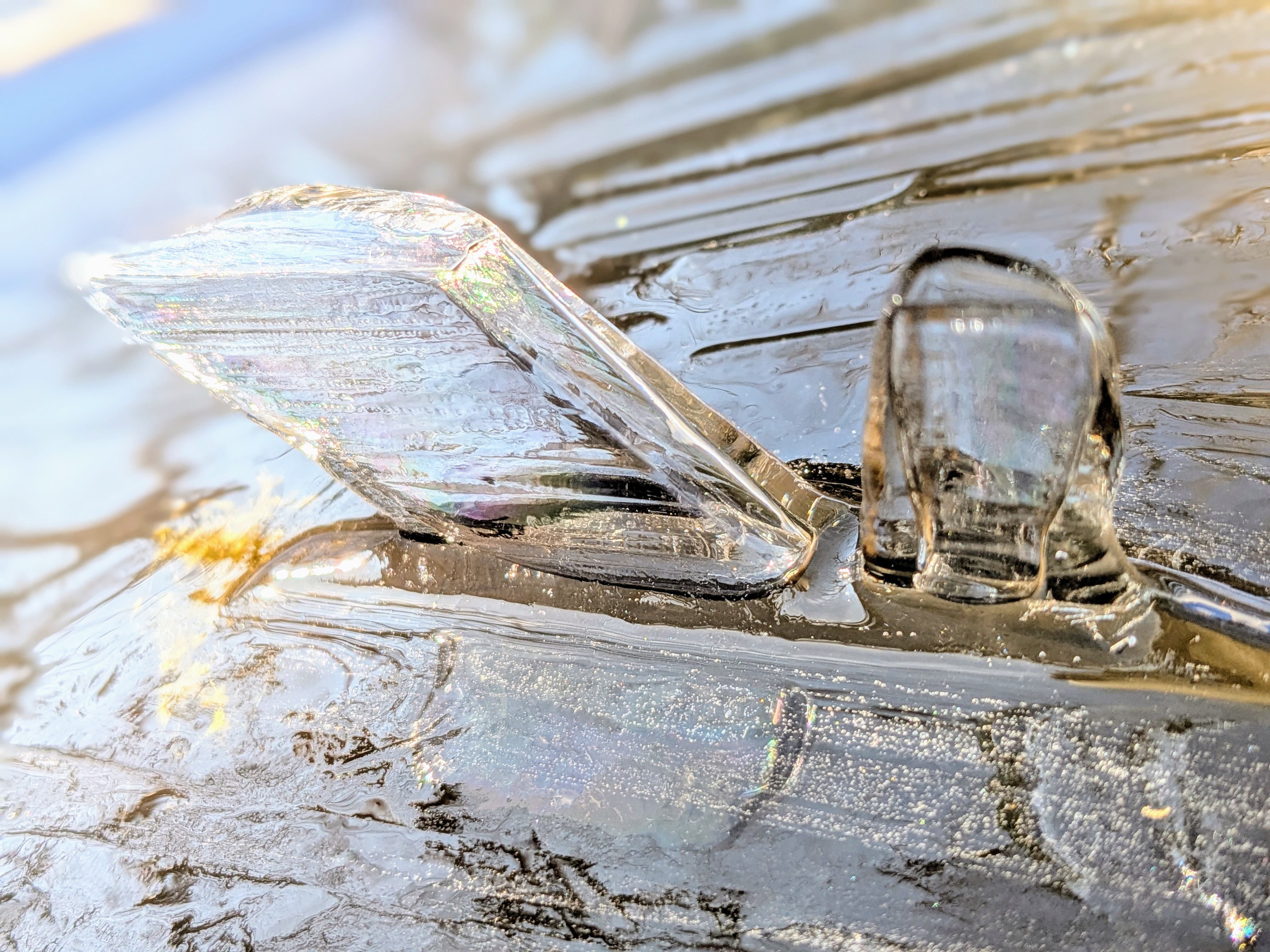 ↑クリスタル、にみえる…….気温がかなり下がった朝のメダカ鉢に張った輝く氷です。